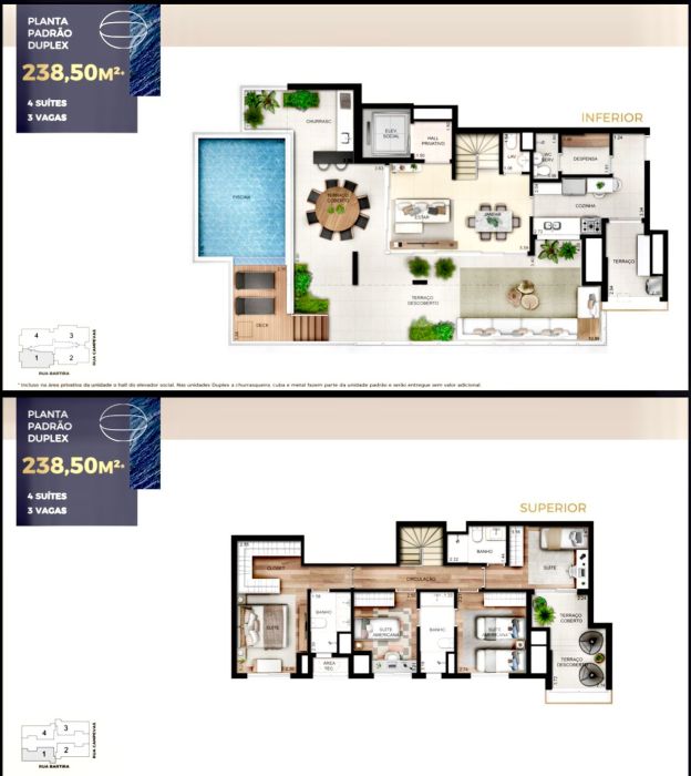 Com uma área privativa de 238 m², a unidade apresenta uma planta inteligente e funcional. O pavimento superior é coroado por uma área de lazer privativa que inclui piscina e sacada com churrasqueira, oferecendo uma vista panorâmica privilegiada da cidade. O imóvel dispõe de quatro suítes amplas, garantindo total privacidade e conforto, além de cinco banheiros, lavabo e uma sala de estar integrada. A área de serviço é completa, contando inclusive com banheiro próprio. Para a conveniência da família, o imóvel oferece três vagas de garagem cobertas.