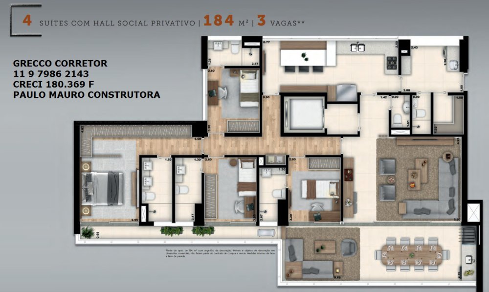 184 m², 3 suítes , 3 vagas, Hall Privativo, varanda gourmet com churrasqueira a carvão.
